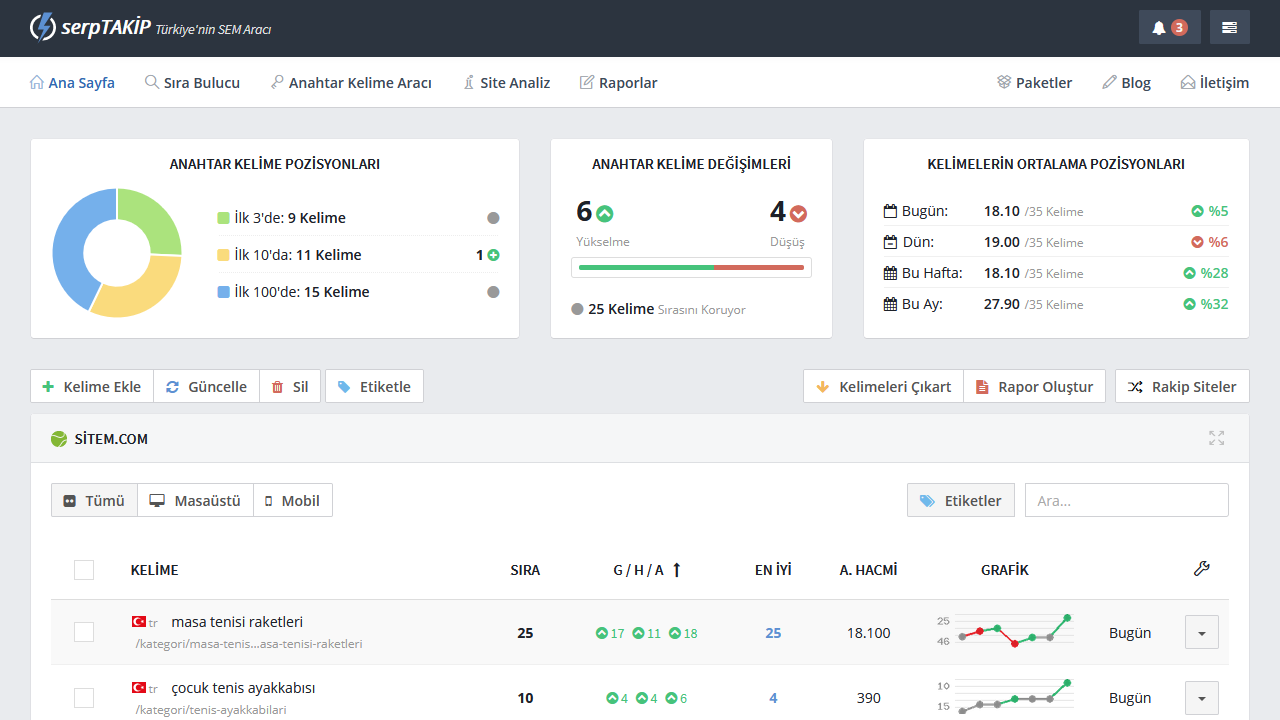 Anahtar kelime bazlı sıralama takibi ile düzenli kontrol.